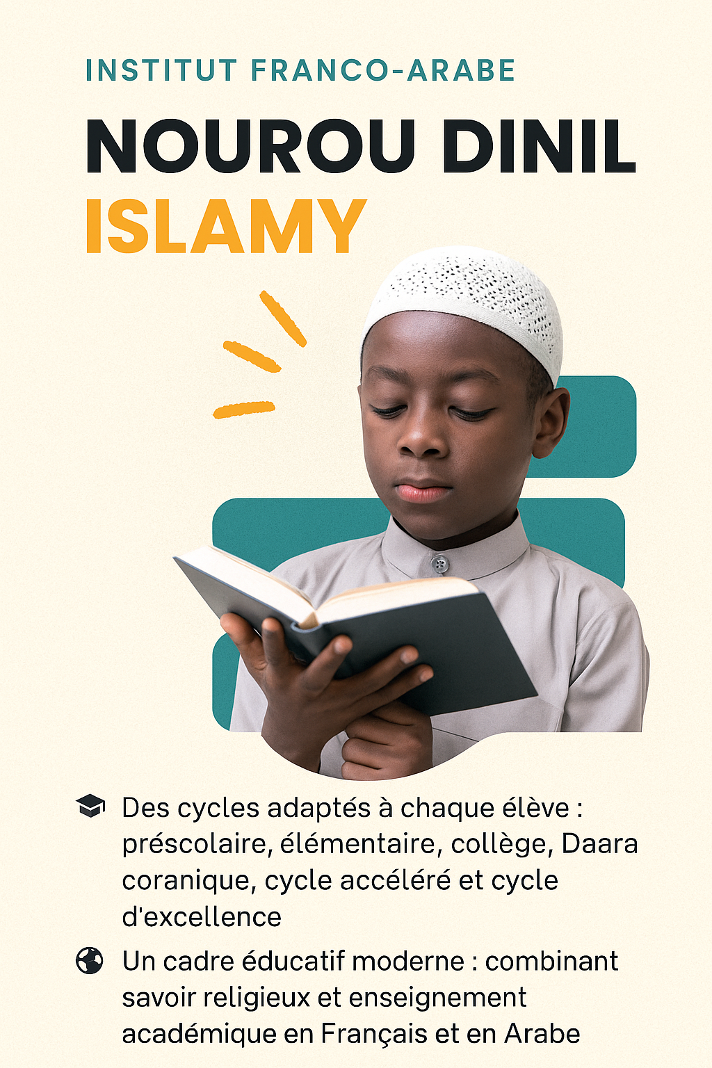 Un enseignement complet en Français et en Arabe, alliant savoir académique et valeurs islamiques.